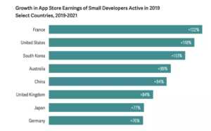 Analysis Group’un raporuna göre, yılda 1 milyon doların altında kazanan ve yıllık bir milyondan az indirmeye sahip olan daha küçük geliştiricilerin geliri, küresel olarak 2019 ile 2021 arasında %113 arttı. ABD’de bu sayı %118 idi. (Araştırma, 1.000’den az indirmeye sahip olanları hariç tuttu.)